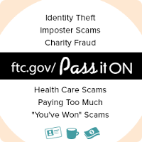 The next time you’re at the library or the grocery store or the gas station, look around. There is a good chance that someone you see has been scammed. Maybe the man at the computer next to you received an email saying he won a prize. Or maybe the woman in front of you at the checkout lane got a phone call from someone claiming to be a “government official”. However, according to the Federal Trade Commission, passing on information about scams to your family and friends is a big part in preventing scams. Sharing WHAT you know can help protect someone WHO you know from a scam. For presentations, activities, and other resources on scams, visit ftc.gov/PassItOn.